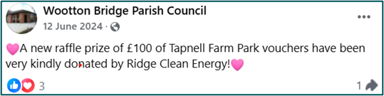 July 2024 & 2023 – Ridge Clean Energy are happy to donate prizes to the raffle and sponsor children’s activities for ‘Party in the Park’ held in Wootton Bridge.