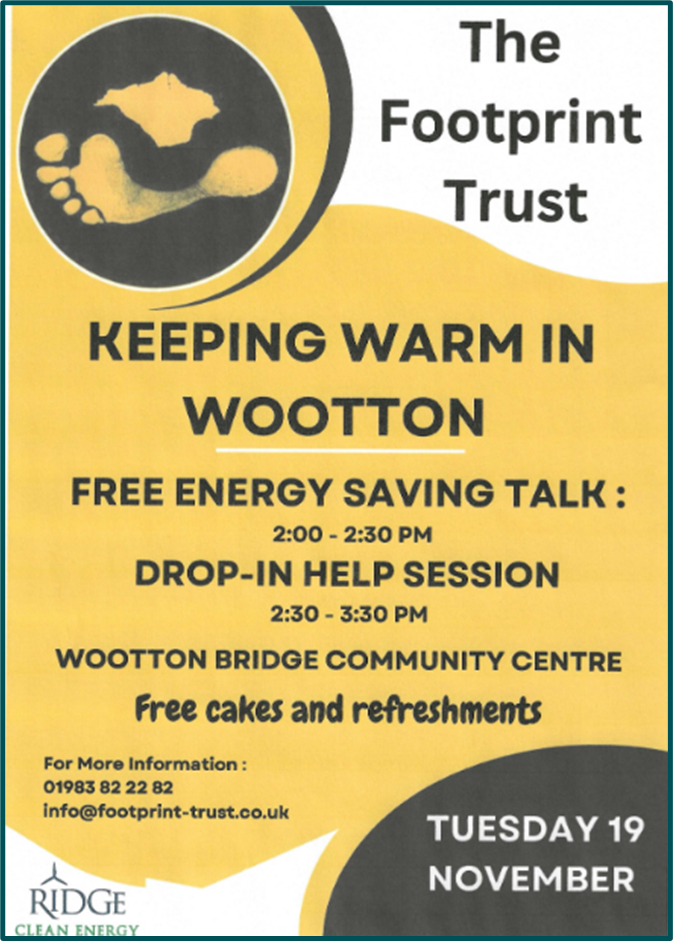 November 2024 – Energy Saving talk for residents of Wootton Bridge funded by Ridge Clean Energy. Personal guidance and follow-up given by The Footprint Trust.