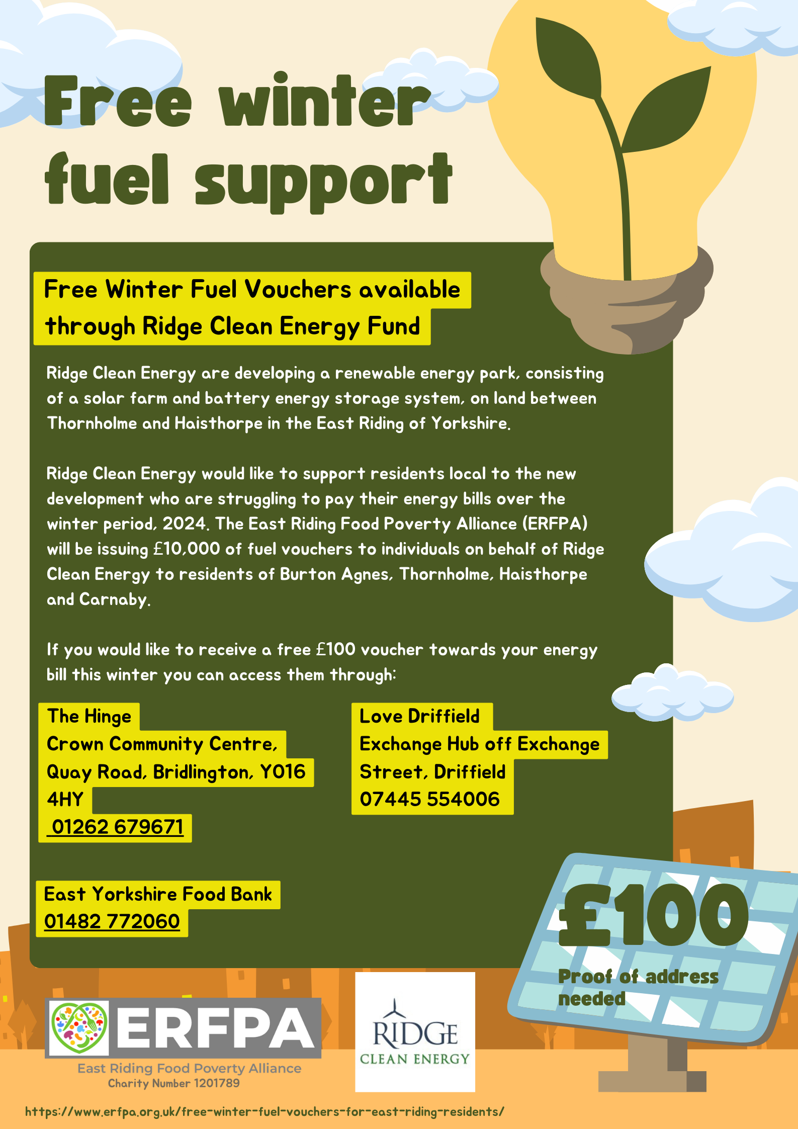 RCE is pleased to work with East Riding Food Poverty Alliance to support people in crisis, living near our proposed Three Oaks Renewable Energy Park project. For the past two years, we have provided funding totalling £11,000, to provide fuel vouchers and emergency food supplies for local people struggling with cost-of-living and fuel costs.